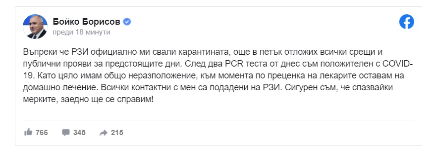 Премиерът Бойко Борисов съобщи във Фейсбук, че е с позитивен тест за коронавирус.